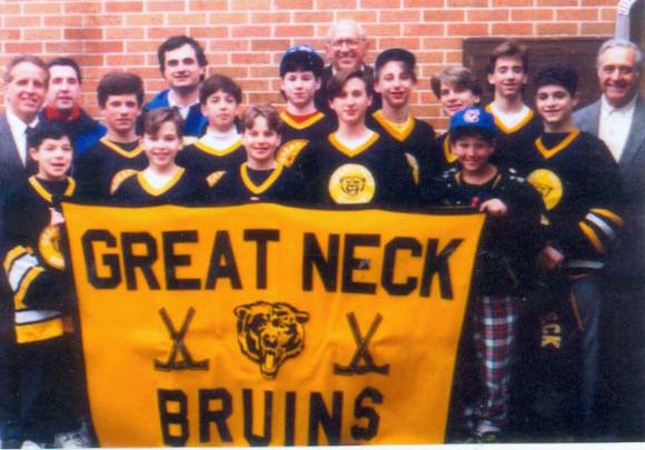 The Great Neck Bruins ice hockey team, of which Andrew eventually became Captain, in approximately 1992, around the time of one of the New York State Championship Tournaments in which the team participated.