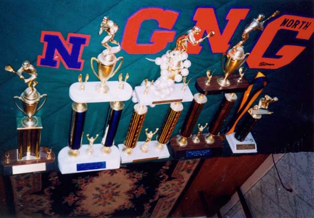 Some of Andrew’s lacrosse trophies, before a banner emblazoned with letters awarded to Andrew was awarded for athletic achievement.