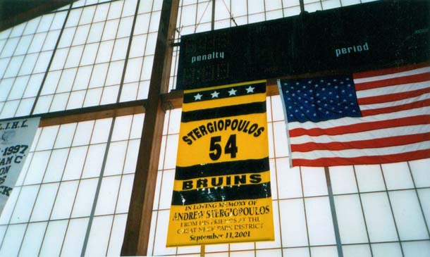 A memorial banner hung at the Andrew Stergiopoulos Memorial Rink in Great Neck, New York on the day in January 2003 on which the rink was named after Andrew. Andrew’s hockey number – 54 – has been retired from the Great Neck Bruins ice hockey team.