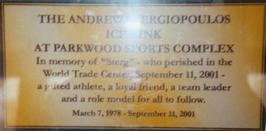 The commemorative plaque at the Andrew Stergiopoulos Memorial Rink in Great Neck, New York, which reads: “The Andrew Stergiopoulos Memorial Rink at Parkwood Sports Complex: In memory of “Sterg” – who perished in the World Trade Center, September 11, 2001 – a gifted athlete, a loyal friend, a team leader and a role model for all to follow. March 7, 1978 – September 11, 2001.” |
